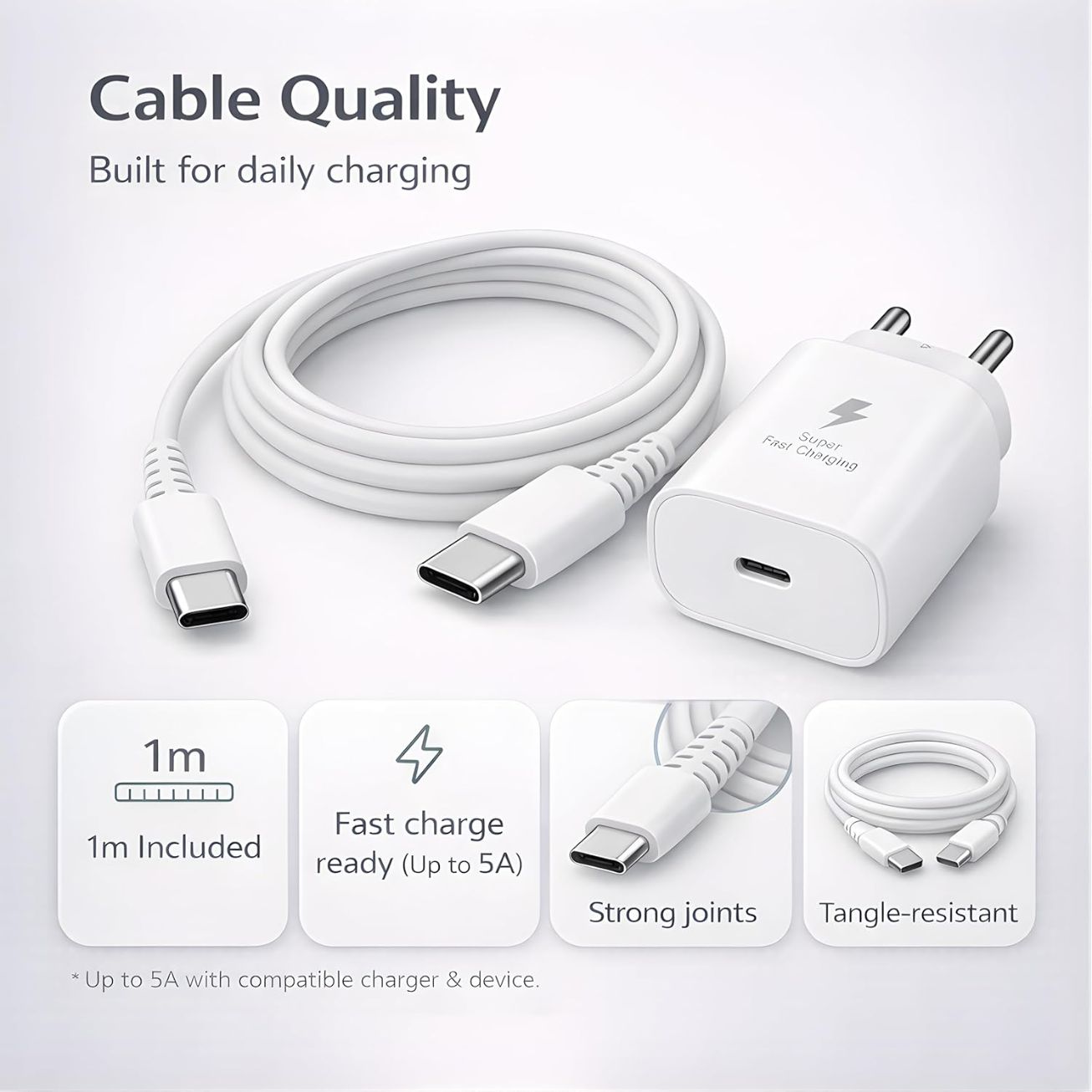 This 25W fast charger ensures optimal charging speed while protecting your device from power fluctuations. Its lightweight and durable design makes it ideal for home, office, and travel use. Compatible with a wide range of Samsung Galaxy phones and USB-C supported devices.